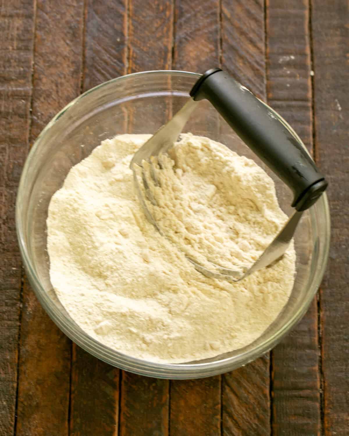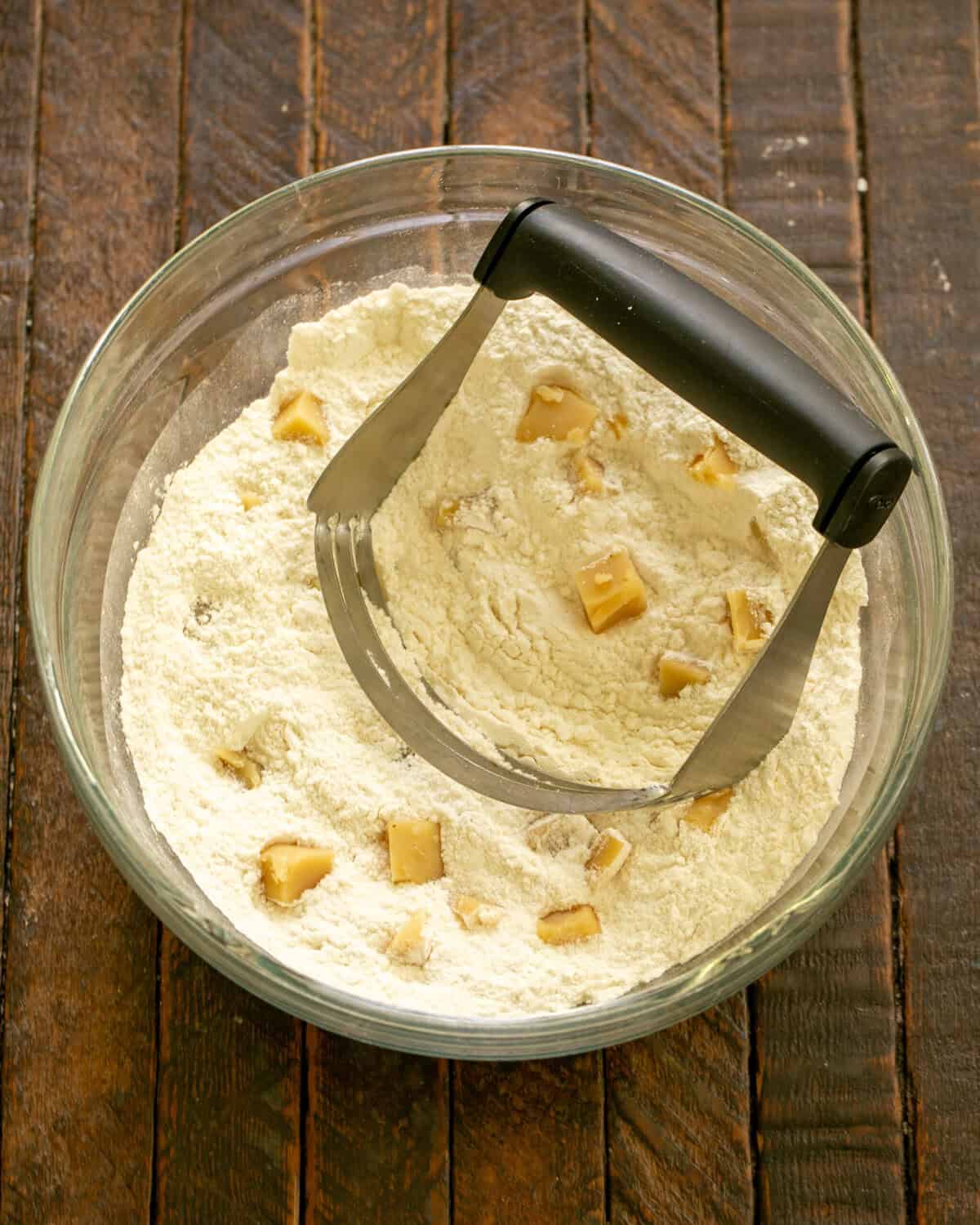 - Cut butter into ½-inch pieces, then scatter over flour mixture. Cut in butter with a pastry blender until it looks like coarse cornmeal with a few slightly larger lumps.